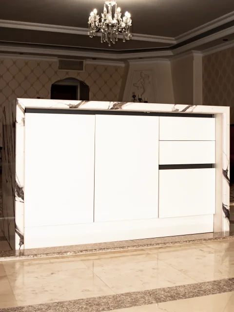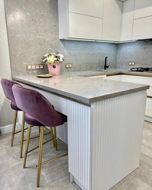 یکی از رایج ترین و پرطرفدارترین صفحات آشپزخانه سنگ ها یا صفحات سنگی مصنوعی مانند اس پی ال، کوارتز، کورین یا مارمونایت ساخته میشوند، که در رنگ های سفید خالص یا صدفی و یا سفید با رگه های ملایم و دانه های ریز نقش که به آن اضافه شده وجود دارند.