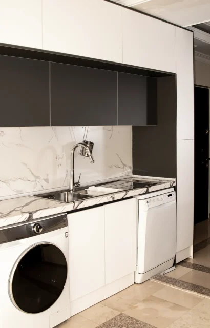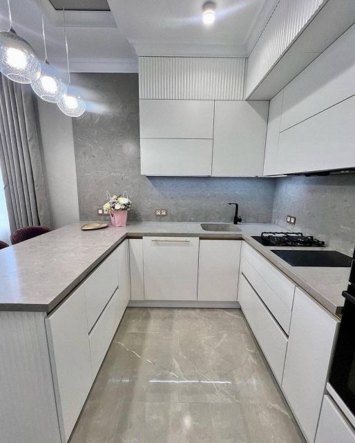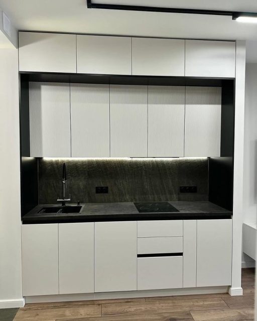 گاهی اوقات شما فقط ترکیب کلاسیک سیاه و سفید یا یک آشپزخانه با کابینت های سفید و کم رنگ را انتخاب می کنید در اینصورت، یک سنگ مصنوعی تیره یا سیاه، در ترکیب با سفید، جلوه ی زیبا و شیکی را به ارمغان می آورد.