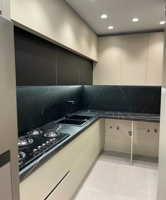 اگر در عین اینکه میخواهید صفحه کابینت تیره داشته باشید ولی فضای آشپزخانهتان دلگیر و کسل کننده نباشد، میتوانید از کد رنگ (رادیانت کوپاکابانا) از متریال مارمونایت که حالت دو رنگ مشکی و کرم دارد استفاده کنید.